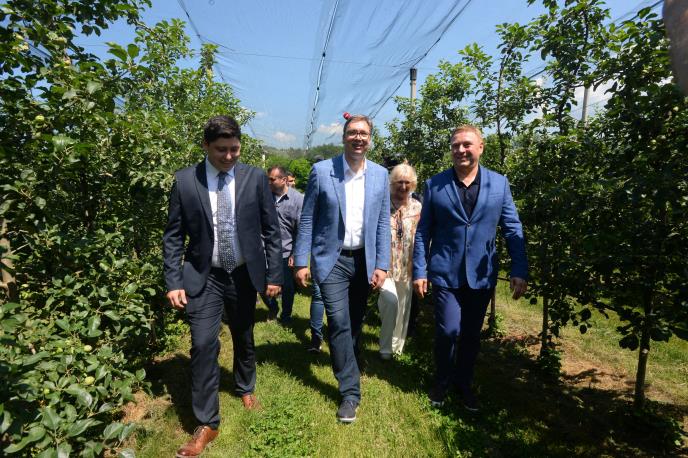 Predsednik Aleksandar Vučić, danas je u Zaječarskom okrugu, obišao zasade jabuka "Tera optima" porodice Jokić i u razgovoru sa lokalnim poljoprivrednicima rekao da država pomaže prerađivačku industriju posebnim podsticajima.