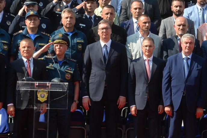 Svečanosti prisustvuju i ministar unutrašnjih poslova Nebojša Stefanović, ministar odbrane Aleksandar Vulin, ministarka pravde Nela Kuburović i ministar za vanredne situacije Ruske Federacije Jevgenij Ziničev, a počela je intoniranjem himni Rusije i Srbije.