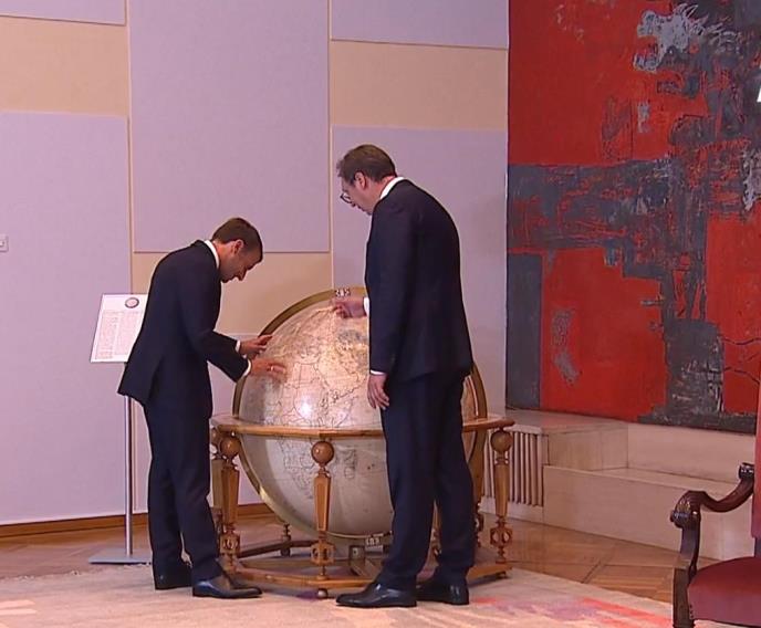 Predsednik Srbije Aleksandar Vucičh pokazao je Emanuelu Makronu, pre zvaničnih razgovora u Palati Srbija, globus - poklon bivšeg predsednika Fransoa Miterana.