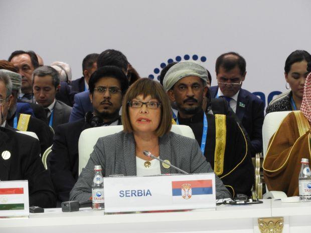 Kako je rekla, Srbija je često bila žrtva suprotnosti principa dijaloga, poverenja i partnerstva, odnosno politike sile i nepoštovanja međunarodnog prava, a primer za to je jednostrano proglašena nezavisnost dela teritorije Republike Srbije.