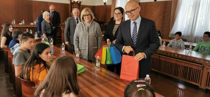 Gradonačelnik Novog Sada je deci koja su prisustvovala prijemu kod gradonačelnika Knina podelio tablet-računare.