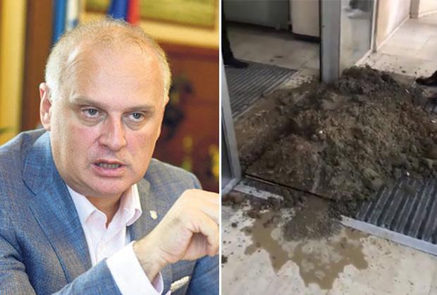 Odbornici Saveza za Srbiju, na čelu sa predsednikom Opštine Stari grad Markom Bastaćem, danas su pred početak sednice gradskog parlamenta na ulaz Skupštine grada prosuli više kanti i džakova zemlje da bi pokazali kako Beograd izgleda zahvaljujići radovima koje izvodi gradska vlast.