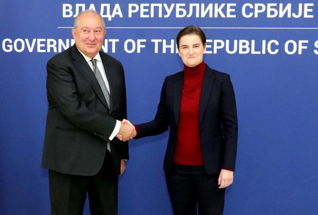 Predsednica Vlade Srbije Ana Brnabić razgovarala je danas sa predsednikom Jermenije, Armenom Sarkisijanom, o potencijalima za unapređenje saradnje dve zemlje, naročito kada je reč o oblastima informaciono-komunikacionih tehnologija i obrazovanja.