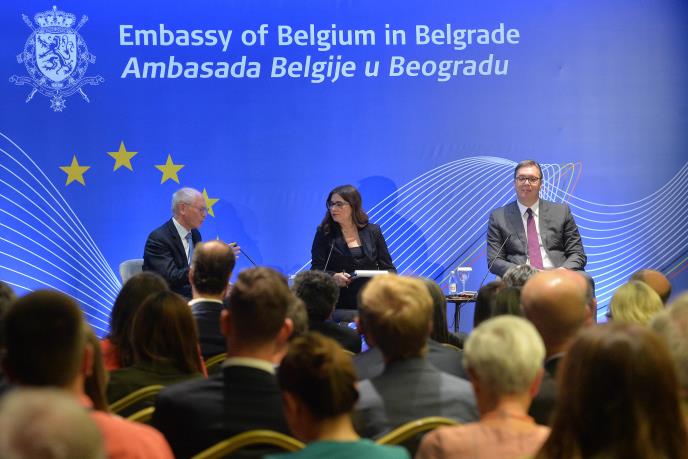 Vučić je na konferenciji "EU i Srbija: zajednička sudbina", na kojoj je sa bivšim predsednikom Evropskog saveta i premijerom Belgije Hermanom van Rompejom razmenio stavove i iskustva na temu evropske budućnosti Srbije, rekao da mu je koristan glas iskrenog i poštenog čoveka kakav je Rompej.
