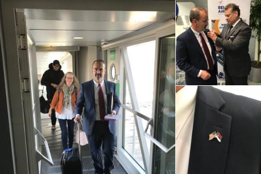 Ambasador je odmah po sletanju dobio i značku sa ukrštenim zastavama...