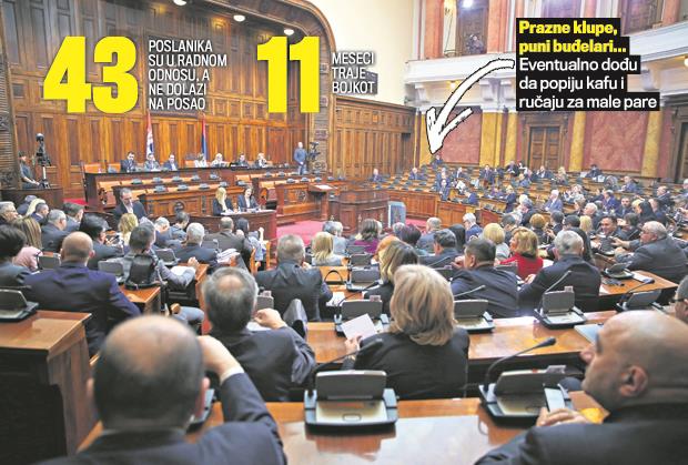- Plate nisu jedini prihodi, opozicioni poslanici koji su proglasili bojkot i koji su iz drugih gradova naplaćuju i troškove prevoza. Oni čak dolaze do Skupštine samo da bi se upisali u knjigu evidencije prisutnih poslanika. Eventualno popiju kafu i ručaju za male pare u skupštinskom restoranu, po povlašćenim cenama. Dolazak naplaćuju na mesečnom nivou u iznosu od 15.000 do 20.000 dinara, u zavisnosti iz kog grada putuju - kaže naš izvor.