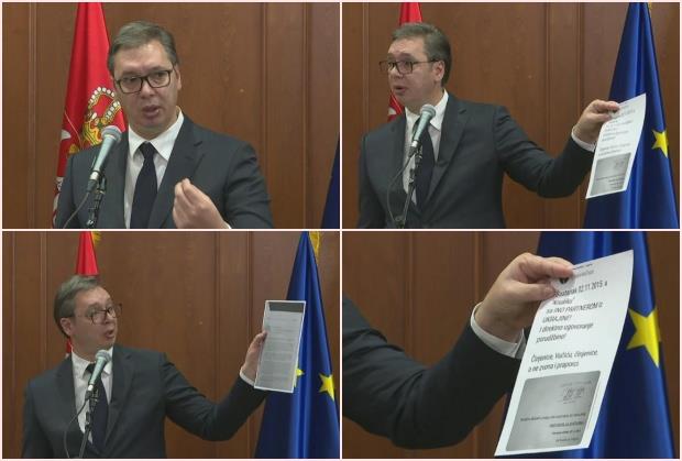 Vučić je novinarima pokazao papir za koji tvrdi da ga imaju i opozicioni političari, ali da su sakrili njegov sadržaj.