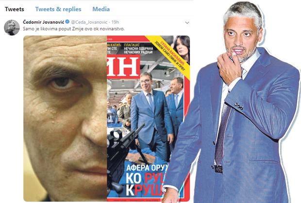 - Samo je likovima poput Zmije ovo okej novinarstvo - napisao je lider LDP Čedomir Jovanović na Tviteru, uz objavljenu fotografiju naslovne NIN i Zvezdana Jovanovića, koji je osuđen na 40 godina zatvora zbog ubistva Đinđića.