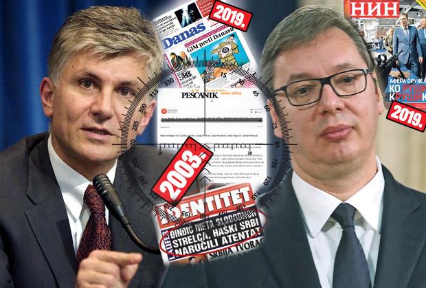 A šta imamo danas? Pa nešto slično kao i tada. Vučića gotovo svakodnevno napadaju u delu medija, osporavaju državnu politiku u vezi sa najvažnijim pitanjima o kojima bismo bar morali da imamo konsenzus - poput Kosova i puta u Evropsku uniju - a onda su neki, tačnije NIN i Danas, otišli i korak dalje, pa su mu nacrtali i metu na čelu. Uz to, sve vreme pokušavaju da ga uvuku u neke od afera, a poslednja u nizu je navodna „trgovina oružjem“.