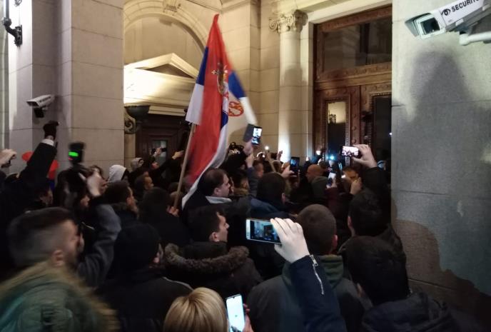 Veliki broj učesnika protesta i bio je na vratima zgrade parlamenta, noseći dve zastave Srbije, a mobilnim telefonima snimali su ulaz u parlament.