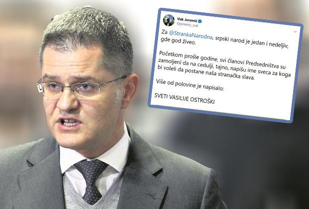 Lider Narodne stranke (NS) Vuk Jeremić lansirao je novu modu - da se krsna slava bira tajno, ispisivanjem imena sveca na cedulji, a onda se pohvalio da su se članovi Predsedništva njegove partije natpolovičnom većinom opredelili za Vasilija Ostroškog.