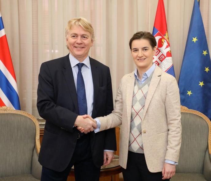 Predsednica Vlade Srbije Ana Brnabić ocenila je u današnjem razgovoru sa ambasadorom Norveške u Srbiji Jernom Eugenom Jelstadom da bilateralne odnose naših država karakteriše razvijen politički dijalog i velike mogućnosti za razvoj ekonomske saradnje.