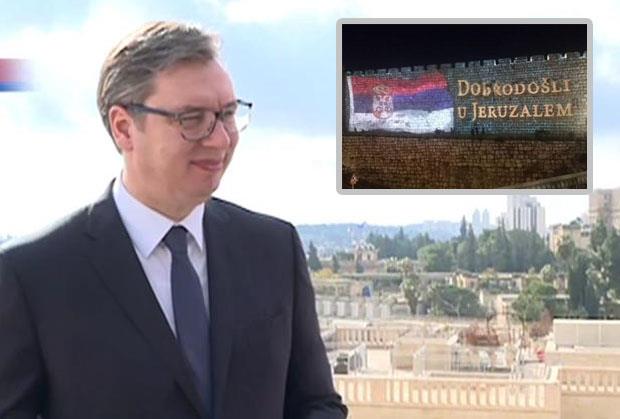 Vučić je takođe objavio i fotografiju sa projekcijom srpske zastave na zidinama Starog grada i natpisa "Dobrodošli u Jerusalim".
