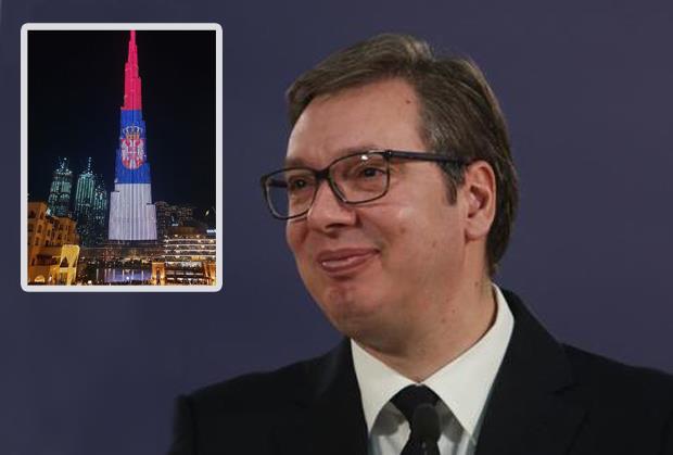 Predsednik Srbije Aleksandar Vučić je na svom nalogu na Instagramu buducnostsrbijeav postavio fotografiju zgrade Burdž Kalifa u Dubaiju i ADNAC centra u Abu Dabiju koji su danas osvetljeni u bojama srpske zastave povodom Dana državnosti Srbije.