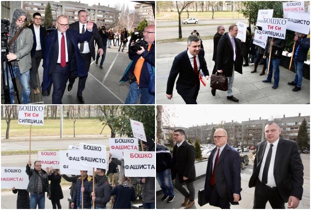 Oni nose transprente "Boško, fašisto", "Boško, ti si siledžija", a Vesića, koji je u sud stigao u 13 sati, dočekali su povicima "Podrška Vesiću".