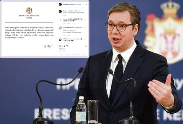 "Kako saznajemo, hotel Nais u vlasništvu Ivice Tončeva otpustio je 60 posto radnika. To je njegovo pravo, ali zbog toga neće imati apsolutno nikakvu podršku države Srbije", objavljeno je na instagram profilu "budućnostsrbijeav".