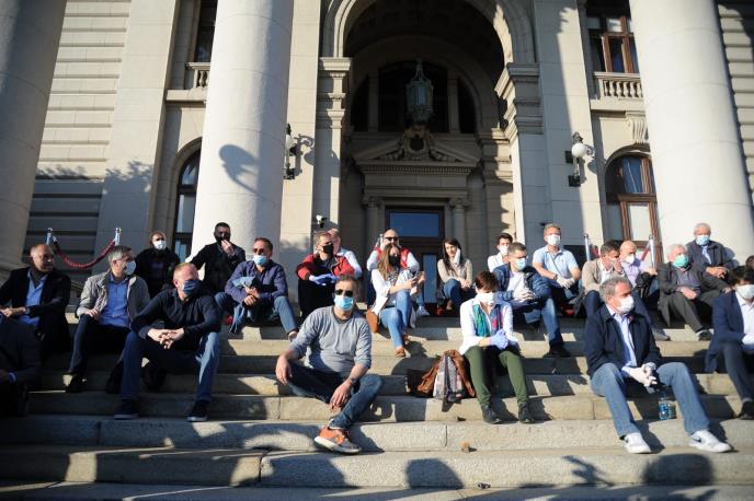 Opozicionari su sedeli na stepeništu ispred Doma Narodne Skupštine, očigledno bez jasnog cilja i ideje, s obzirom na to da je policijski čas za prvomajski praznik, a što je njima navodno bio povod okupljanja, novom odlukom Kriznog štaba Vlade drastično skraćen i trajaće do subotu u pet ujutru.