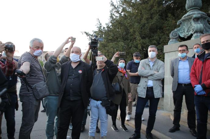 Lideri dela opozicionih stranaka, njih nekolicina predvođeni liderom SSP Draganom Đilasom, Sregejem Trifunovićem iz PSG, Zoranom Lutovcem, šefom DS, Boškom Obradovićem iz Dveri, Borisom Tadićem, liderom SDS, okupilo se juče nešto posle 18 sati, na početku policijskog časa, ispred Doma Narodne Skupštine u Beogradu.