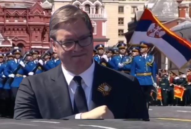 Vučić je sa tribina, odakle sa predsednikom Rusije Vladimirom Putinom i drugim visokim zvaničnicima prati paradu, stavio ruku na srce, čime je pokazao koliko je ponosan što uz ruske vojnike danas na Crvenom trgu marširaju i srpski gardisti.