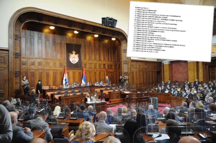 Nova Vlada Srbije imaće 21 ministarstvo, navodi se u Predlogu zakona o ministarstvima, koji je u skupštinsku proceduru uputila grupa od 167 poslanika.