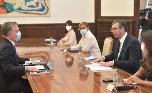 BEOGRAD - Predsednik Srbije Aleksandar Vučić sastao se danas sa šefom misije Saveta Evrope u Beogradu Tobijasom Flesenkemperom, sa kojim je razgovarao o primeni programa SE u Srbiji, kao i o daljim koracima usmerenim ka partnerstvu i zajedničkom radu na svim pitanjima od obostranog interesa.
