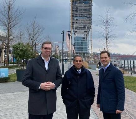 BEOGRAD - Predsednik Srbije Aleksandar Vučić obišao je danas radove na izgradnji Kule Beograd u kompleksu "Beograd na vodi", sa ministrom finasnija Sinišom Malim i predsednikom kompanije "Iglhils" Mohamedom Alabarom.
