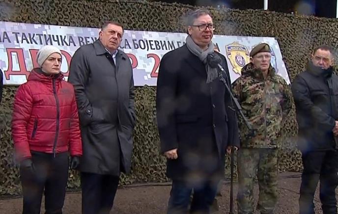 Predsednik Srbije Aleksandar Vučić danas je posle završene taktičke vežbe Odgovor 2021 na dva poligona u Orešcu kod Vršca i na Pasuljanskim livadama rekao da je ponosan na Vojsku Srbije i policiju Srbije.