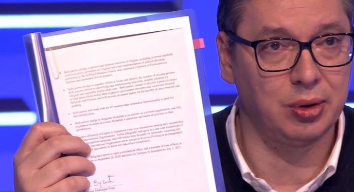 "On nije previše lošeg rekao osim jedne stvari. Rekao je da je Srbija zajedno sa Prištinom učestvovao u tome. Ja sam doneo da se vidi sporazum gde ja nikada nisam potpisao da Izrael prizna (tzv.) Kosovo. Rekao sam i Netanijahuu da ima dve ponude o prebacivanju ambasada. Nisam osuševljen potezom Izraela. Falsifikovali su ga najpre Đilasovi mediji, a onda su govorili da smo mi spinovali izraelskog ambasadora. Srbija nije učestvovala u tome i neće da učestvuje", rekao je predsednik pokazujući primer sporazuma u Vašingtonu.