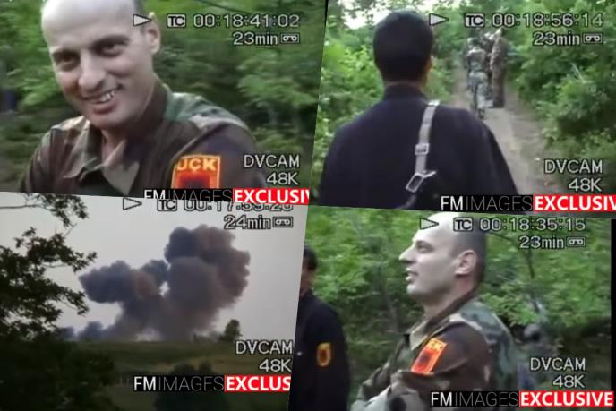 Među teroristima OVK nalazi se i Agim Čeku koji uz smeh za kameru potvrđuje da se na položajima sa kojih se uzdiže dim nalaze Srbi.