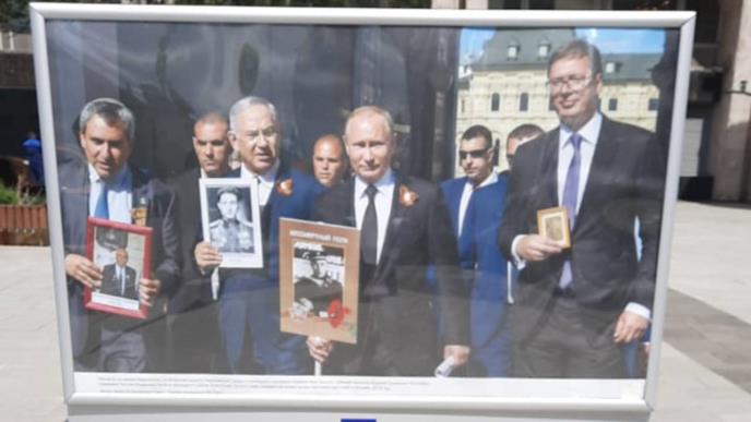 Veliki bilbord sa fotografijom - koja je nastala pre dve godine, tokom šetnje Besmrtnog puka za Dan pobede, a posle velike vojne parade u centru Moskve, postavljena je ispred novinske agencije Tass.