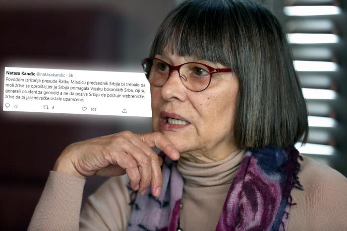 - Povodom izricanja presude Ratku Mladiću predsednik Srbije bi trebalo da moli žrtve za oproštaj, jer je Srbija pomagala vojsku bosanskih Srba, čiji su generali osuđeni za genocid, a ne da poziva Srbiju da poštuje srebreničke žrtve da bi jasenovačke ostale upamćene - napisala je Kandić.