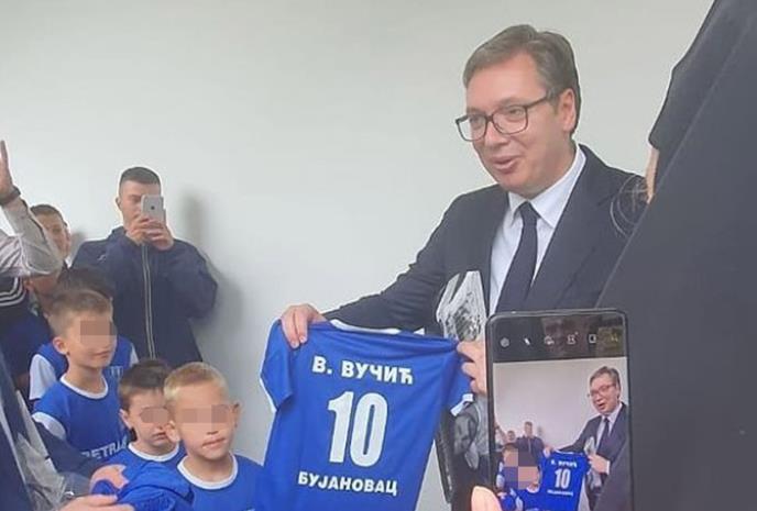 Naime, predsednik Srbije je od ''pionira'' FK Bujanovac dobio dres tog kluba sa brojem 10 na kojem piše ''V.Vučić'', a prigodni pokloni uručeni su i mladim fudbalerima.