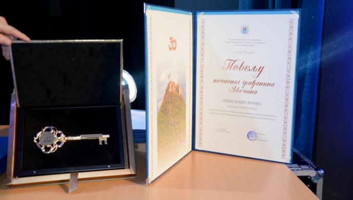 Predsednik Aleksandar Vučić proglašen je danas za počasnog građanina Zvečana, a ključeve grada u njegovo ime primio je direktor Kancelarije za KiM Petar Petković na svečanoj akademiji povodom 30 godina od osnivanja opštine.
