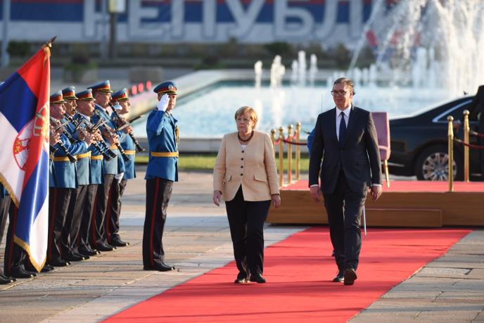 Svečani doček za Angelu Merkel priređen je ispred Palate Srbija u 18.00 nakon čega je usledio razgovor sa predsednikom Srbije Aleksandrom Vučićem i potom zajednička konferencija za novinare.