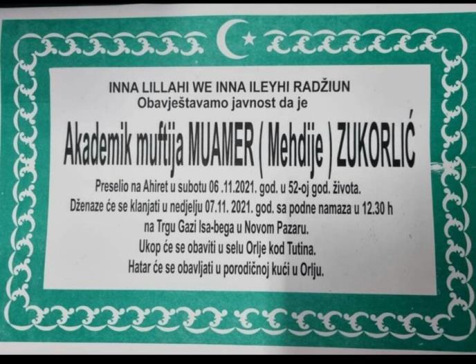Kako stoji na umrlici dženaza će se klanjati sa podne namaza u 12:30 sati na Trgu Gazi Isa-bega u Novom Pazaru.