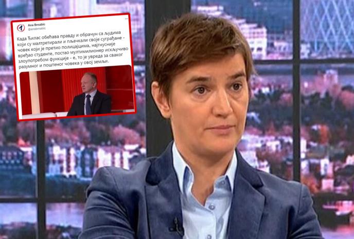 "Kada Đilas obećava pravdu i obračun sa ljudima koji su maltretirali i pljačkali svoje sugrađane - čovek koji je pretio policajcima, najgnusnije vređao studente, postao multimilioner isključivo zloupotrebom funkcije - e, to je uvreda za svakog razumnog i poštenog čoveka u ovoj zemlji", napisala je premijerka Brnabić.