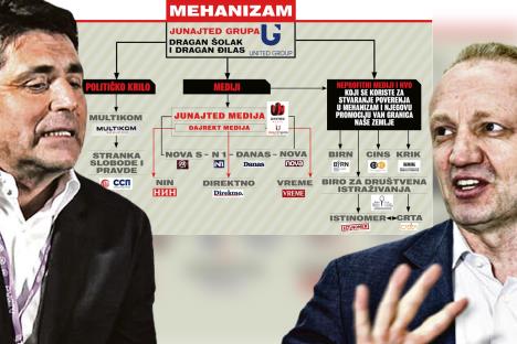 Vrh piramide i mozak mehanizma predstavljaju kompanija Junajted grupa i njen vlasnik Dragan Šolak. S obzirom na to da je reč o firmi koja se bavi kablovskim provajdingom, ključni momenat u njenom rastu predstavljao je trenutak kada je dobijen pristanak vlasti u Srbiji da se kablovskim provajderima dozvoli da ujedno budu i vlasnici medija i proizvođači TV programa. Ono što se decenijama unazad smatralo demokratskim standardom u borbi protiv koncentracije vlasništva u medijima, u Srbiji je srušeno zakonima iz 2014. godine, što je bilo posledica trulog kompromisa i specifične konstelacije interesa u tom trenutku, ali i uspešnog lobiranja UG u Briselu.