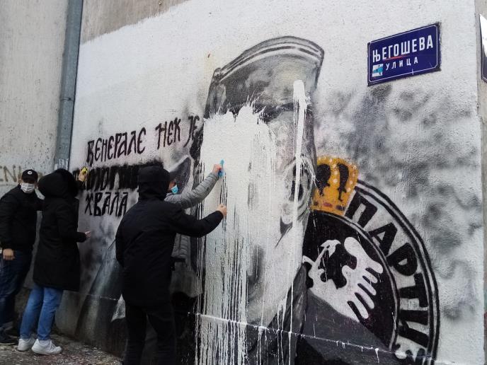 BEOGRAD - U samom centru Beograda, u Njegoševoj ulici, jutros je na mural Ratku Mladiću, haškom osuđeniku i nekadašnjem komandantu VRS bačena bela farba.