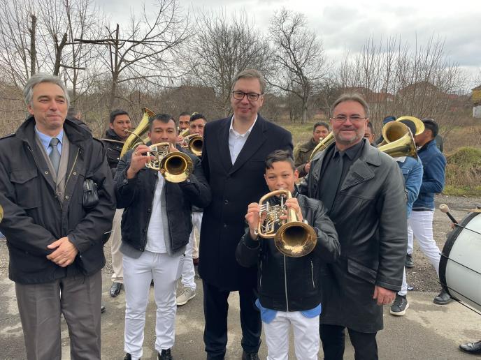 Predsednika je pozdravilo više od 2.000 ljudi, a on je pozirao sa trubačima koji su svirali na dočeku.