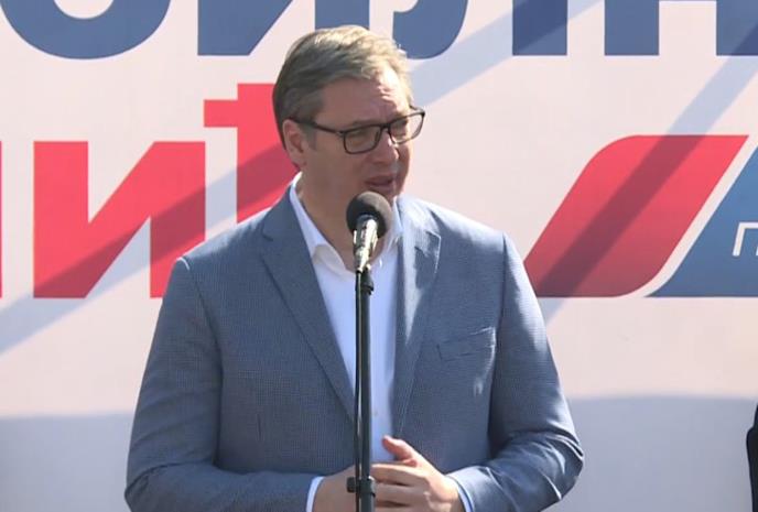 "Srbija mora da se razvija, Srbija mora da misli na svoju ekonomiju, Srbija mora da razmišlja o platama i penzijama, i zato smo rekli u narednom mandatu, i pre kraja mandata, da će prosečna plata biti preko 1000 evra, a prosečna penzija preko 500 evra. To je cilj koji ćemo ostvariti ako dobijemo vašu podršku i vaše poverenje", poručuje Vučić.