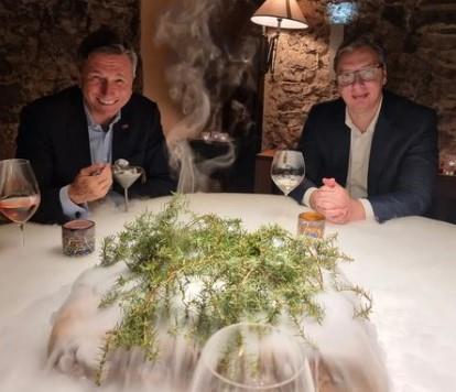 BEOGRAD - Predsednik Srbije Aleksandar Vučić završio je jednodnevnu posetu Sloveniji a veliko interesovanje izazvala je fotografija na njegovom zvaničnom Instagram nalogu Budućnost Srbije sa večere koja je sinoć priređena u njegovu čast, a na kojoj je bio s kolegom Borutom Pahorom.