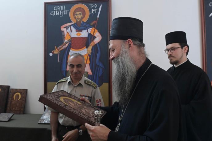 Rukovodilac duborezačke sekcije Vojne akademije potpukovnik Dragan Todorov uručio je patrijarhu Porfiriju ikonu Presvete Bogorodice u duborezu i ikonu Svetog Georgija u duborezu ministru Stefanoviću.