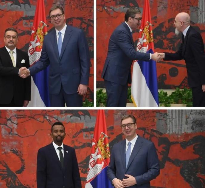 BEOGRAD - Predsednik Srbije Aleksandar Vučić primio je danas akreditivna pisma novoimenovanih ambasadora Iraka i Somalije, Mohameda Hakima Abida Alija Al Rubajija i Muhameda Abdulahija.