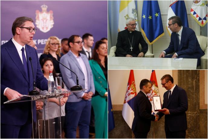 Na video snimku prikazani su događaji koji su obeležili radni dan predsednika. On je danas najpre primio u oproštajnu posetu apostoloskog nuncija nadbiskupa Lučana Surijanija, potom je bivšem selektoru ženske odbojkaške reprezentacije Srbije Zoranu Terziću Sretenjski orden drugog reda za naročite zasluge u sportskoj delatnosti i postignute rezultate, a potom je primio i prvu generaciju polaznika programa Barvalipe.