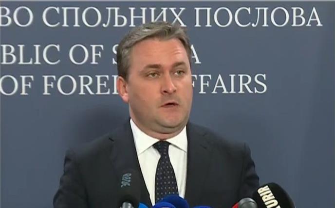 Šef srpske diplomatije Nikola Selaković obraća se javnosti na vanrednoj konferenciji za medije povodom zabrane privatne posete Jasenovcu koju su hrvatske vlasti izrekle predsedniku Srbije Aleksandru Vučiću.