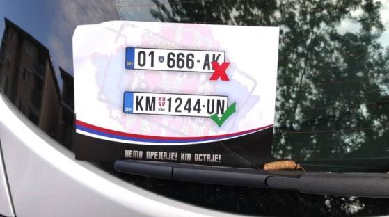 "Nema predaje – KM ostaje!"- poruka je na flajerima zakačenim na automobile u glavnoj ulici, uz fotografije "KM" i "RKS" tablice.