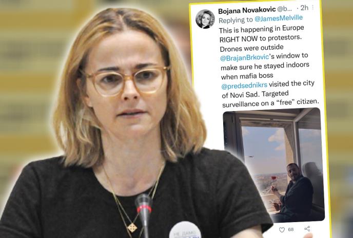 - Ovo se dešava u Evropi upravo sada demonstrantima. Dronovi su bili ispred prozora Brajana Brkovića kako bi se uverili da je ostao u kući kada je mafijaški bos Aleksandar Vučić posetio grad Novi Sad. Ciljani nadzor nad "slobodnim" građaninom - napisala je Bojana Novaković.