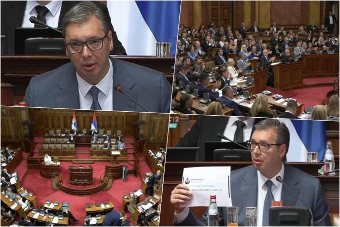 Predsednik Vučić, uprkos svim tim napadima, nije se dao isprovocirati. Kao i jutros u 10 sati, kada je sednica počela, istovetnim mirnim tonom odgovara na provokacije i večeras posle 22 sata.