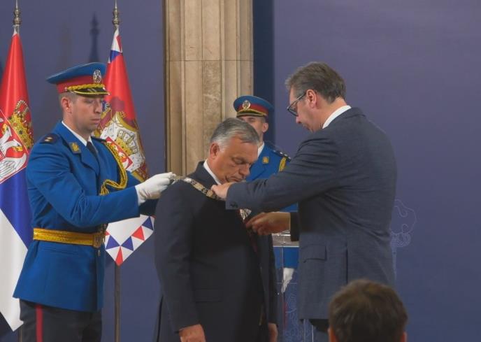Predsednik Aleksandar Vučić odlikovao je mađarskog premijera Viktora Orbana Ordenom Republike Srbije na velikoj ogrlici za izuzetne zasluge u razvijanju i učvršćivanju miroljubive saradnje i prijateljskih odnosa dve zemlje.
