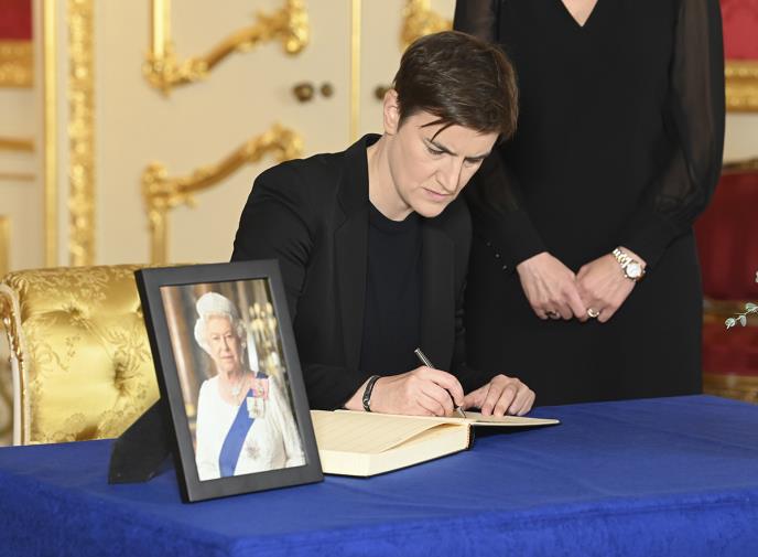 Predsednica Vlade predstavlja Republiku Srbiju. Ona se juče upisala i u Knjigu žalosti koja je otvorena povodom smrti britanske vladarke.